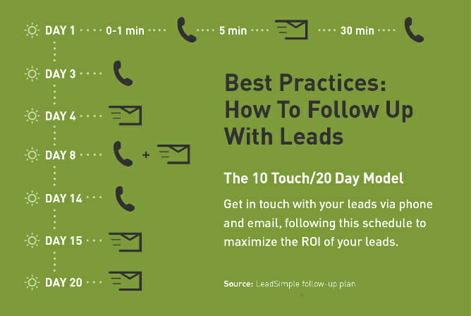 How can you reach that benchmark? Be persistent. Some say to stay in touch with the lead for 60 days, though others, like LeadSimple, recommend 20 days. LeadSimple dives a bit deeperand suggests a 20-day, 10-touch model, meaning that over the course of 20 days, you should reach out via phone and email 10 different times.